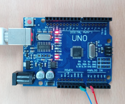 전압 발생(예, 심전도 ECG)의 출력 신호 SIG(빨간선)를 아두이노 우노 보드의 아날로그 인 A0에 연결하고, 접지 GND(파란선)를 우노 보드의 접지 GND에 연결한다.